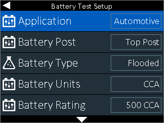 Enter battery details based on the battery which is being tested. (NOTE: The CPX will default to Automotive, Top Post, Flooded, CCA and 500 CCA values.)