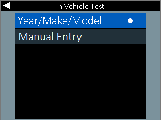 Step 2: YMM or Manual Entry SelectionSelect the method to obtain battery details. Year/Make/Model automatically populates the battery details based on the vehicle information entered. Manual Entry goes direct to the Battery Test Setup screen and the user must enter the battery details manually.