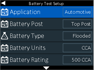 Step 4: Battery Test SetupIf YMM was selected, confirm battery information. NOTE: It is important to confirm the battery details since battery replacement may have occurred in the past that does not match the OE specifications.