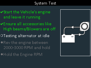Use In Vehicle Test to perform Battery Tests on in-vehicle batteries using test parameters determined by entering the Year/Make/Model of the vehicle or through manual entry of battery parameters. A System Test for Starter and Charging testing is also available.