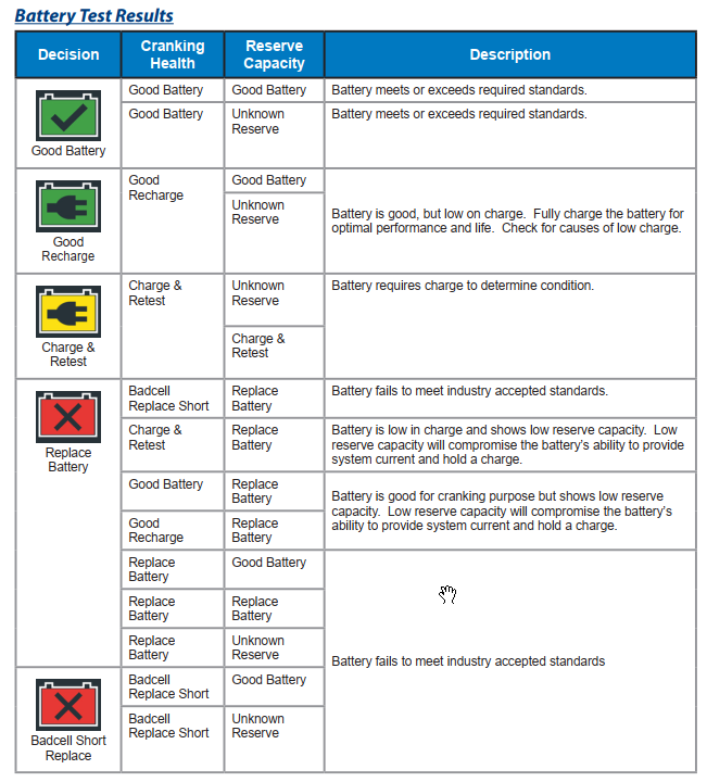 The overall decision of the CPX-900 is based on the combined result of the cranking and reserve heath testing. A failure during either testing results in a Replace battery result