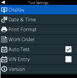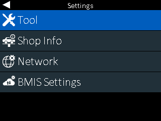 Use the Settings Menu to setup/adjust the tool, shop information, network connection or BMIS settings.